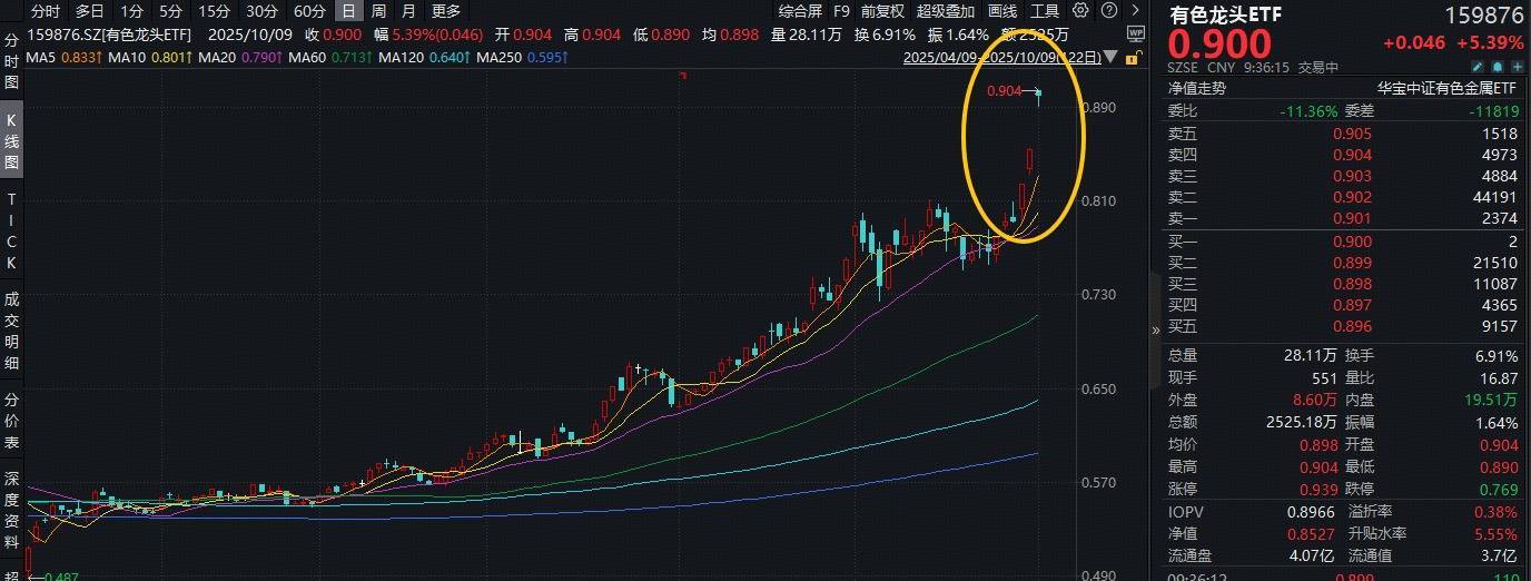 国庆假期期间,有色金属板块无疑成为了焦点中的焦点,万众期待之下,节后第一个交易日(10月9日)有色金属板块断层领涨两市,揽尽有色金属行业龙头的有色龙头ETF(159876)跳空大涨,场内价格飙涨5.39%,刷新上市以来的高点!截至发稿,该ETF获资金实时净申购2460万份!