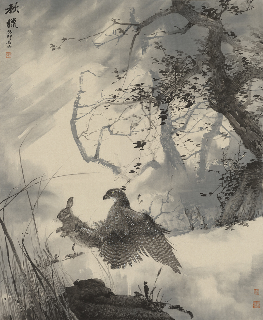 传统花鸟作品中,中国美术学院的张铨作品《秋猎》以水墨营造秋林禽戏之境,枯树虬枝以苍劲线条勾勒,墨色层次浑融;禽鸟动态鲜活,羽毛质感借墨渍染得灵动自然。笔墨苍润空濛,既承传统花鸟“写生传真” 之法,又以虚实章法传递秋意里的生命意趣。