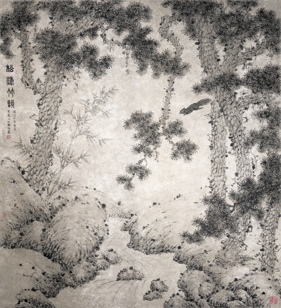 来自天津美术学院霍岩的《松涛竹韵》则书写了绘事“寓兴于草木” 的古典神韵,以骨法用笔写苍松遒劲、修竹疏秀,墨色渍染层次蕴藉,松针、竹枝勾勒精谨灵动。