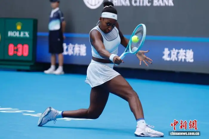 10月2日,在北京进行的2025中国网球公开赛女子单打四分之一决赛中,美国选手高芙以2:0战胜德国选手利斯,晋级四强。图为高芙在比赛中。中新社记者 韩海丹 摄